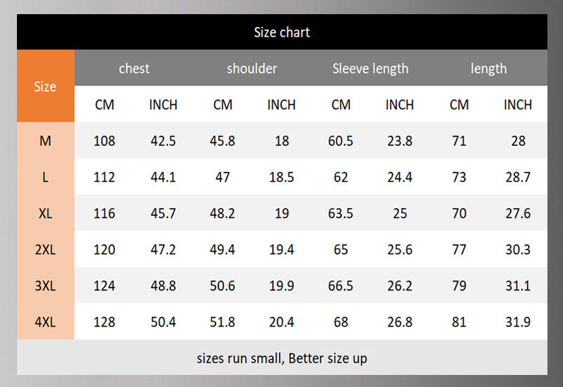 Size Chest (inches) Shoulder (inches) Length (inches) XS 36–37 17 29 S 38–39 17.5 29.5 M 40–41 18 30 L 42–43 18.5 30.5 XL 44–45 19 31 2XL 46–47 19.5 32 3XL 48–49 20 32.5 4XL 50–52 20.5 33
